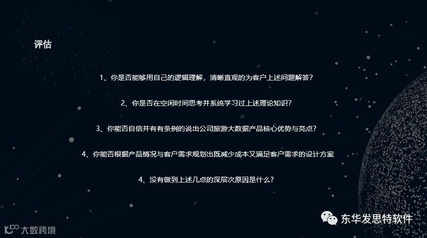 讲述了智慧旅游产品的产品理念、设计思路、技术架构、核心亮点、旅游产品的数据优势、服务模式、售前策略等,各位系统认知智慧旅游产品并进一步学习了售前宣讲方式技巧。