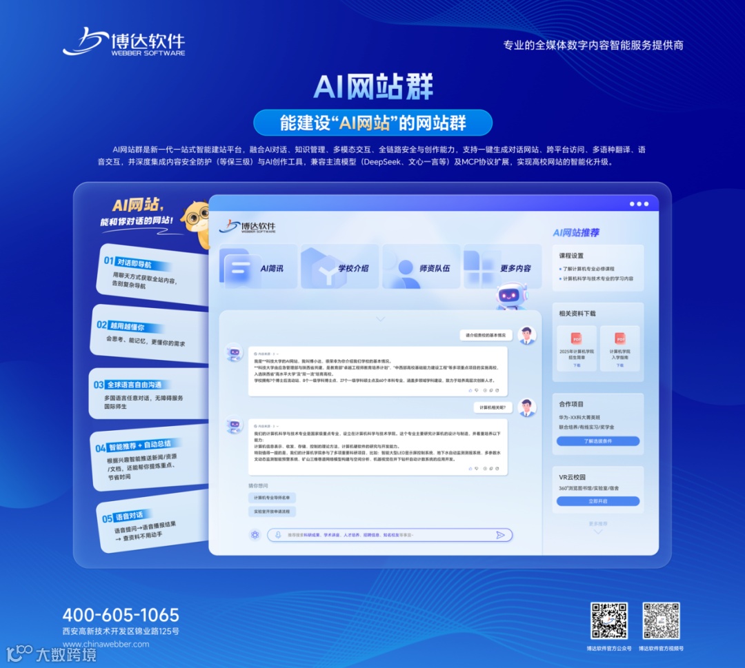 AI网站群是新一代一站式智能建站平台,融合AI对话、知识管理、多模态交互、全链路安全与创作能力,支持一键生成对话网站、跨平台访问、多语种翻译、语音交互,并深度集成内容安全防护(等保三级)与AI创作工具,兼容主流模型(DeepSeek、文心一言等)及MCP协议扩展,实现高校网站的智能化升级。