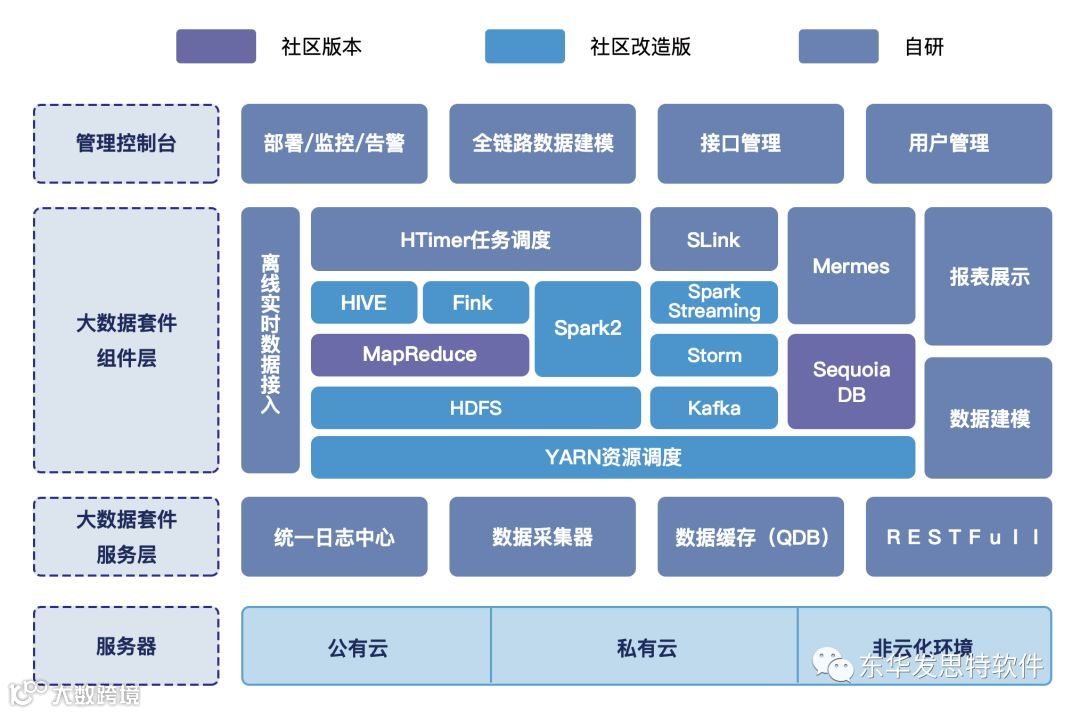 本平台基于开源的Hadoop大数据处理体系(HDFS、HIVE、SPARK、STORM等)及Sequora DB分布式文档存储中心,并自主研发了数据采集器、日志中心、RESTFull API等大数据套件服务层、报表组件及管理控制台;可部署于公有云、私有云及非云化环境。
