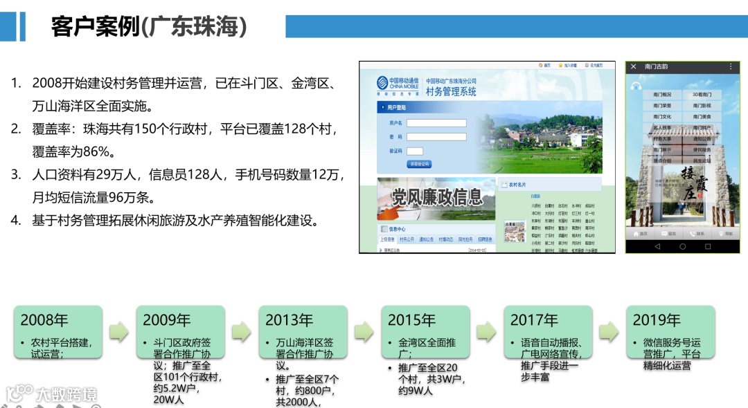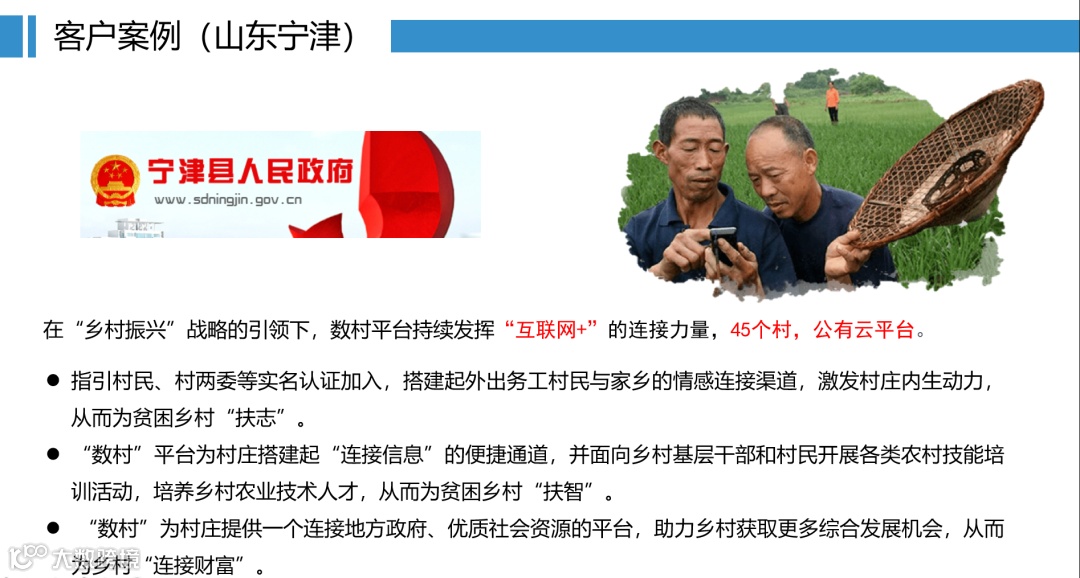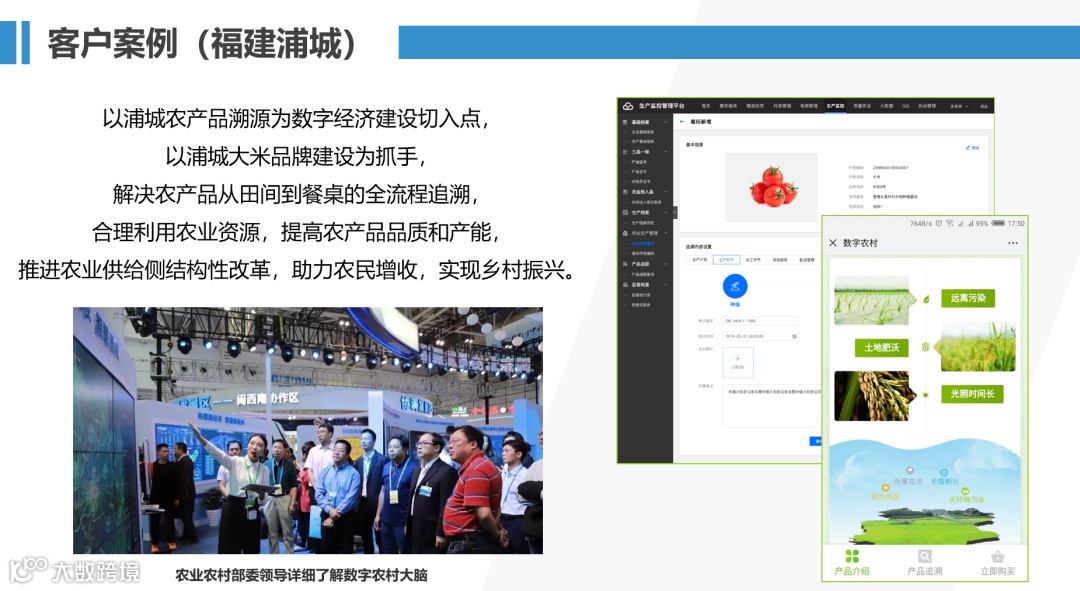 分析了目前农业农村在生产、管理和服务方面上存在的问题,也剖析了历年乡村发展政策指引,结合发展情况和国家政策,朱悦引出了“WeCountryside”的概念--以“数字产业化、产业数字化”为发展主线,以人为中心,以乡村为主战场。随即给我们介绍三大产品矩阵:数村小程序(WeLink)、数字农业(WeFarm)、农村综合管理(WeLead),满足用户各类要求,并且展示了多个经典案例应证产品的可行性。
