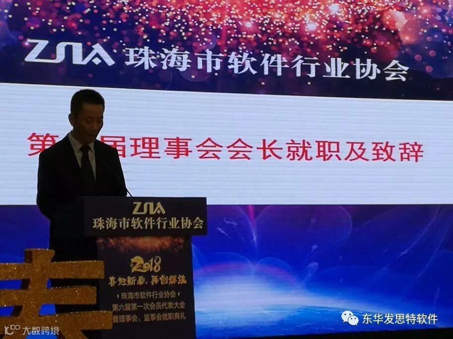 2017年12月15日下午珠海市软件行业协会在珠海度假村酒店“星际厅”隆重召开第六届第一次会员代表大会暨理事会、监事会就职典礼,广东东华发思特软件有限公司当选为副会长单位,蒙圣光总裁当选为第六届理事会副会长。