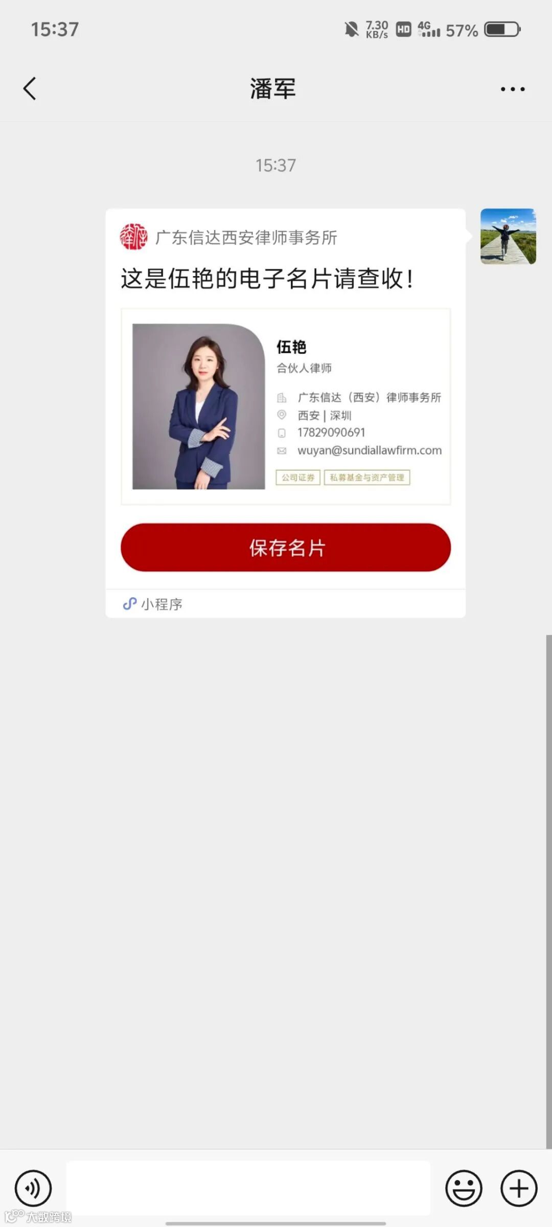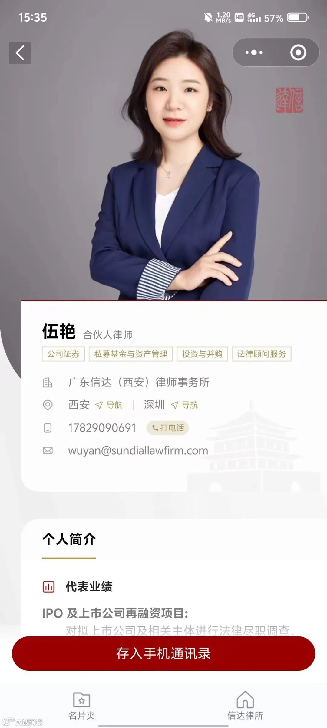 以点带面,凸显律所实力:名片小程序不仅限于个人展示,更巧妙地融入了律所的移动端官网,实现了信息的无缝对接与共享。接收方在了解律师个人风采的同时,也能一键触达律所的整体介绍、专业领域、成功案例等丰富内容,全方位感受广东信达(西安)律师事务所的雄厚实力与专业水准。