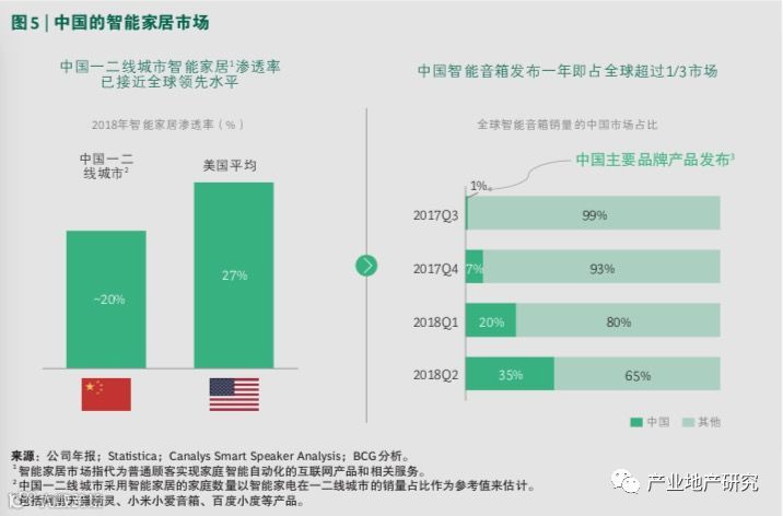住(参阅图 5):在家居行业,近年来,中国智能家居市场呈现爆发性地增长,未来 将成为智能家居销售的主战场。从整体智能家居发展来看,目前,中国的一二线城市的智 能家居渗透率已经达到约 20%4,逼近全球智能家居最领先国家美国的 27%5。以具体的智能 音箱产品为例,在 2017 年第三季度,中国销量仅占全球市场的 1%。而在一年后的 2018 第 二季度末,中国销量已经占全球市场的三分之一 6。