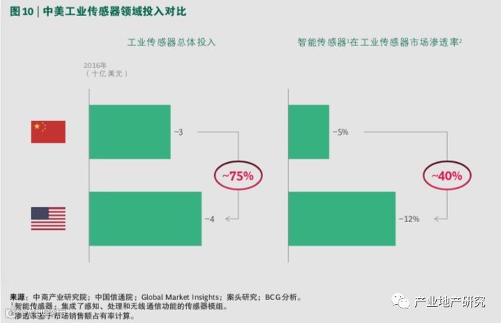 智能互联(参阅图 10):特指相互连接的机器、设备、传感器和人员。中国在装备的 智能化水平方面亟待提高。以传感器为例,中国在工业传感器上的总体投入 8 与美国相比 虽然相差较小,但是在对智能互联程度起到关键性作用的智能传感器方面仍存在较大差距。中国的智能传感器在工业传感器的渗透率 9,相较美国的约 12%,仅约为 5%。