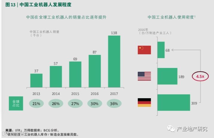 人机协作(参阅图 13):特指智能机器及人工协作完成高负荷和重复性的制造工作。中国在与人机协作相关的先进制造技术的普及程度有待提高。以工业机器人为例,虽然中 国在全球工业机器人的销量占比逐步攀升 12,但是中国工业机器人的使用密度仍远远低于 发达国家水平 13。