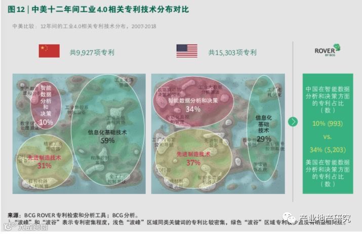 技术及先进制造技术的发展,但对智能数据分析和决策方面仍落后于美国。根据 BCG 专 利分析工具ROVER® 的分析,在中国,与智能数据分析以及决策相关技术的专利占比仅有10%,对应的专利数为993,而这一比例在美国为 34%,对应的专利数为 5,203。