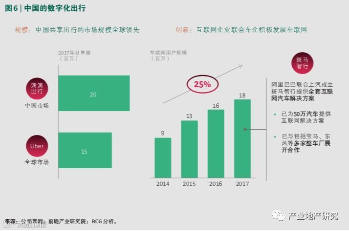 行(参阅图 6):在出行行业,数字化共享出行方式在中国大行其道。以中国为主要 市场的滴滴出行在规模上远远领先全球市场运营的 Uber。根据官方网站及报道,2017 年 滴滴出行在中国的日订单量已经达到 2,000 万单,而 Uber 在全球的日订单量为 1,500 单。同时,互联网企业积极联合整车企业发展车联网业务。举例来说,阿里巴巴与上汽联合成 立的斑马智行已为 50 万汽车提供互联网解决方案,并且与包括宝马、东风在内的多家整车 企业开展合作。
