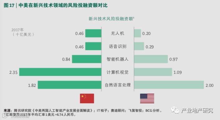 除此之外,中国在部分其他的新兴技术领域也得到了雄厚的市场资金支持。以风投为 例,中国在无人机、语音识别、计算机视觉以及自然语言处理领域的投融资总额均超过了 美国 20(参阅图 17)。