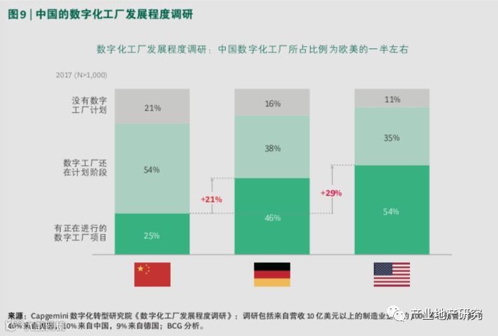 反观后端,以制造业例,虽然中国制造业领域的数字化发展迅速,发展意愿高,但是 总体发展水平仍处于追赶全球领先水平的阶段,行业的数字化能力仍待加强。以数字化工厂为例,根据 Capgemini 针对全球 1,000 个制造业企业的调研 7 显示,截至 2017 年 3 月,中 国现有数字化工厂所占比例为 25%,仅为美国与德国的一半左右(参阅图 9)。
