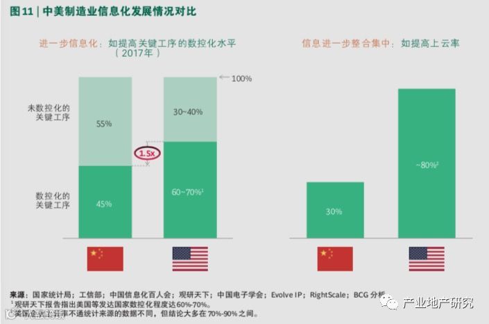 信息整合(参阅图 11):特指跨系统的全数据信息整合,实现对物理制造世界的完全 数字化再现。中国的工业信息化水平仍落后于领先国家。中国仍需进一步推进信息化以及 信息整合。在进一步信息化方面,以关键制造工序的数控化程度为例 11,中国制造业关键 工序的数控化程度仍然低于美国。在信息进一步整合方面,以上云率为例,中国企业上云 率仅为 30%,明显低于美国。