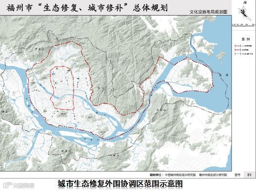 城市生态修复外围协调区的具体边界为:南北以福州市区外围一重山体视线可达范围为边界,将鼓山、莲花山、旗山、五虎山、大象山、首石山等外围山体的部分山体纳入保护范围,并将鼓山风景区全部纳入范围之中;东侧以中心城区范围为界、西侧以港边村南北向道路至路腰山一线为界与南北一重山体线相连,将闽江、乌龙江、内河水系及闽江河口湿地等沿江近海湿地纳入保护范围。