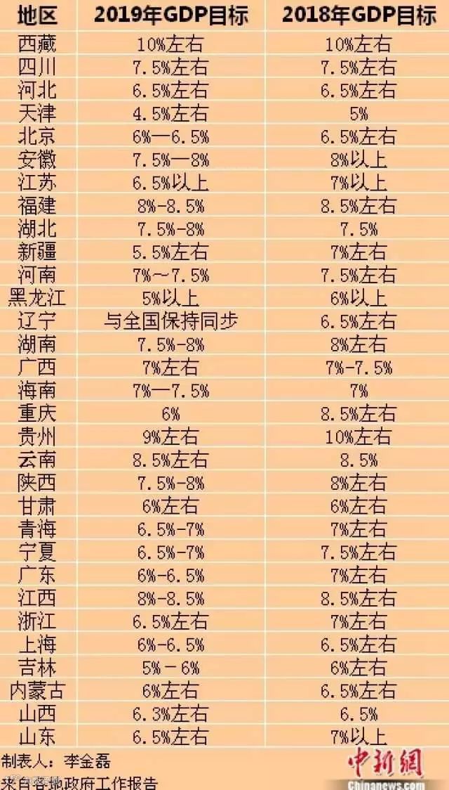 以2018年GDP总量前三名的省份为例,广东2019年GDP增速目标由去年的7%左右调整至6%-6.5%;江苏由去年的7%以上调整至6.5%以上;山东由去年的7%以上下调到6.5%左右。