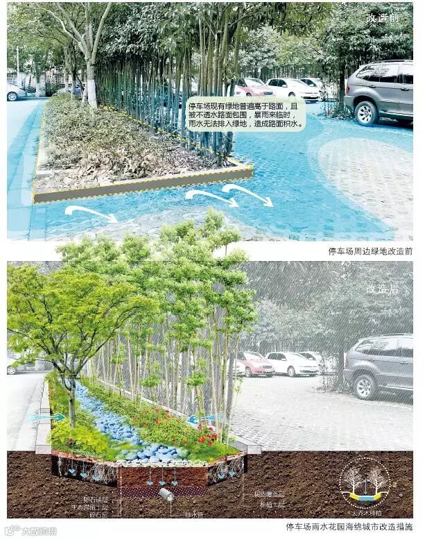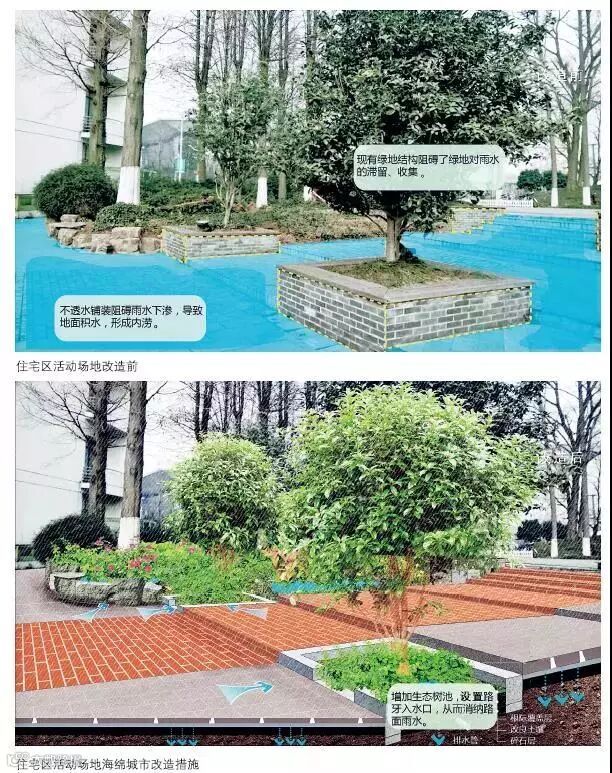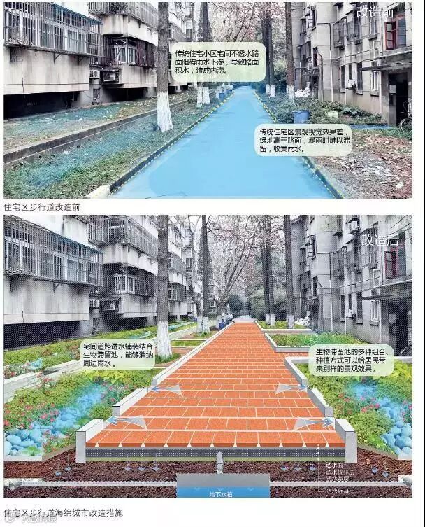 传统住宅区中的宅间道路和绿化带可以改造成透水路面和生物滞留池,用来收集道路上的雨水,避免路面雨水沉积对居民生活造成影响。