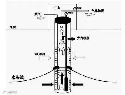 将吹脱、空气注入、气相抽提、强化生物修复和化学氧化等多种技术结合应用在井中,能够促进污染物的溶解和运移,通过在井内曝气,使地下水形成循环,携带溶解在地下水中的挥发和半挥发性有机物进入内井,通过曝气吹脱去除。