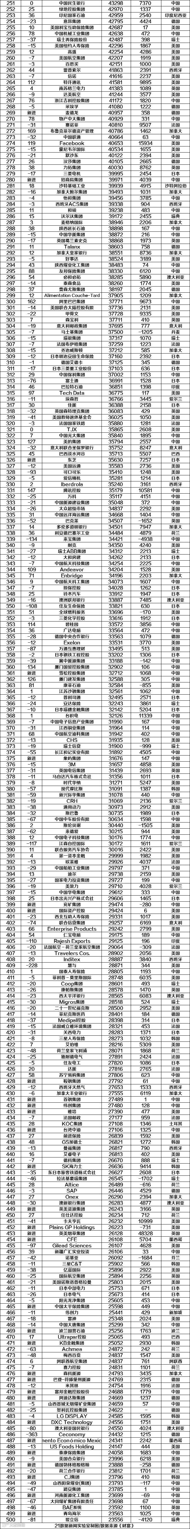 招商局集团(280名)、雪松控股(361名)、象屿集团(375名)、兖矿集团(399名)、鞍钢集团(428名)、首钢集团(431名)、纬创集团(432名)、台湾中油(436名)、中国太平保险集团(465名)、富邦金融控股(479名)、泰康保险集团(489名)、河南能源化工集团(496名)、青岛海尔(499名)。