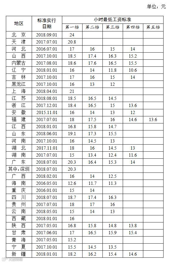 全国各地区小时最低工资标准情况(截至2018年9月),来源人社部官网