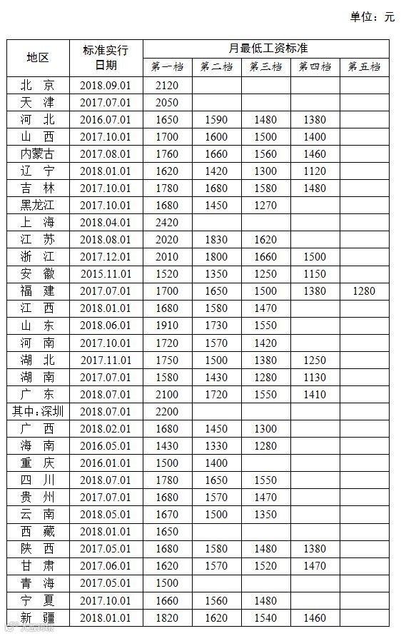 全国各地区月最低工资标准情况(截至2018年9月),来源人社部官网