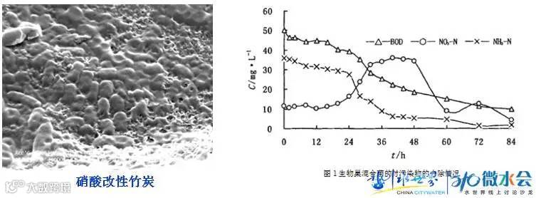 填料采用蜂窝状硝酸改性竹炭,由数据可看出BOD浓度迅速降低,去除率可达50%,同时氨氮在硝化作用下浓度也迅速降低,硝态氮则经历一个先生后将的过程。