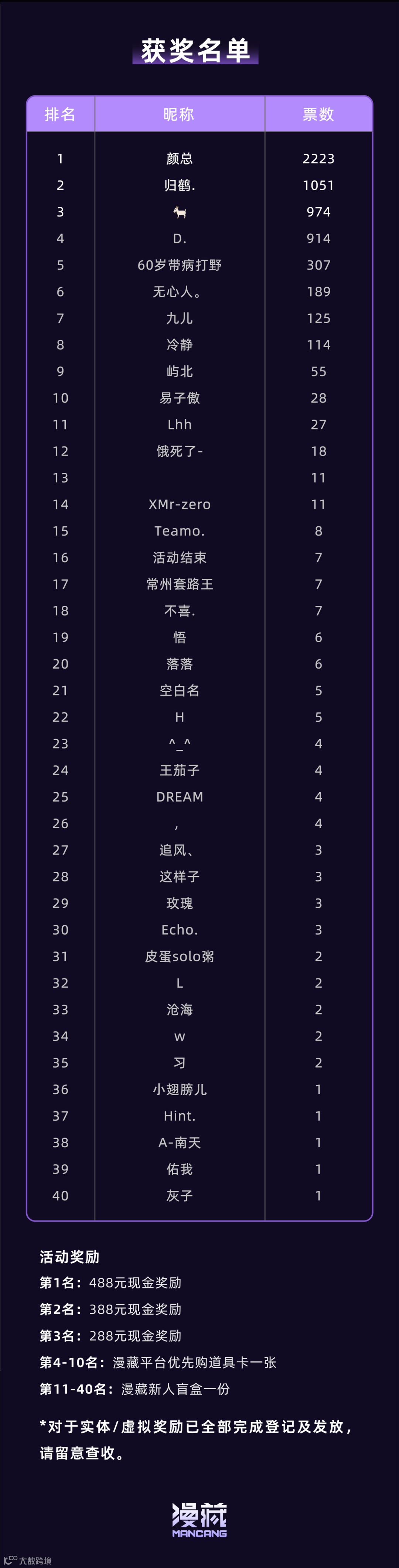 经过官方审核团队的整理、统计、审核,最终我们选出了40名获奖者,将获得漫藏道具以及现金奖励等丰厚大礼包!