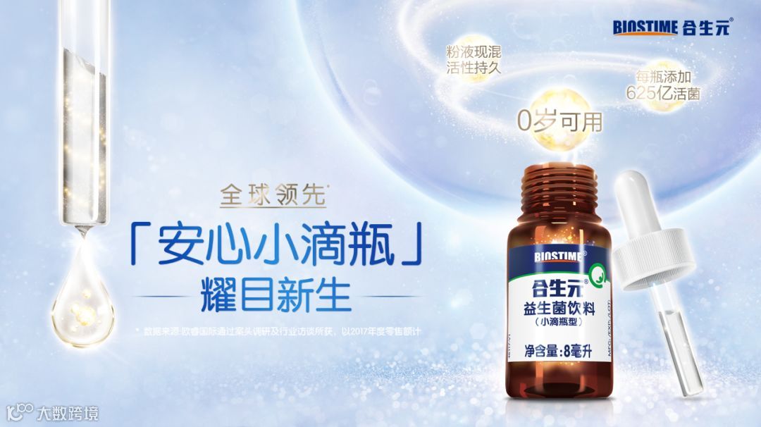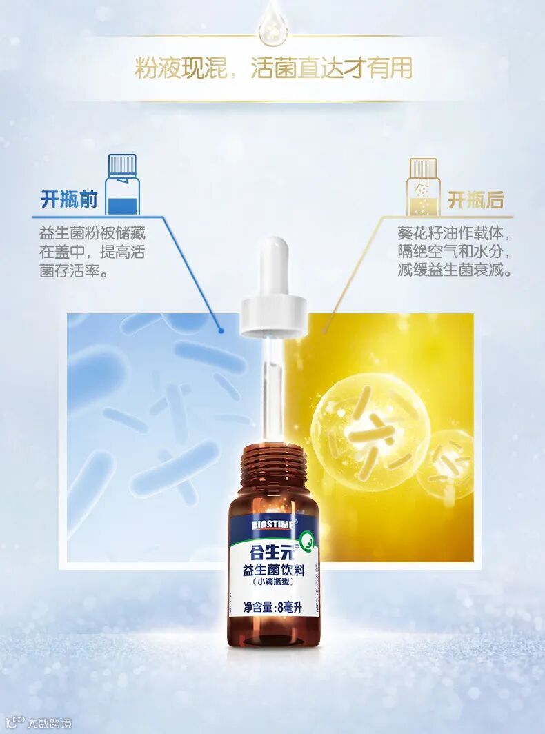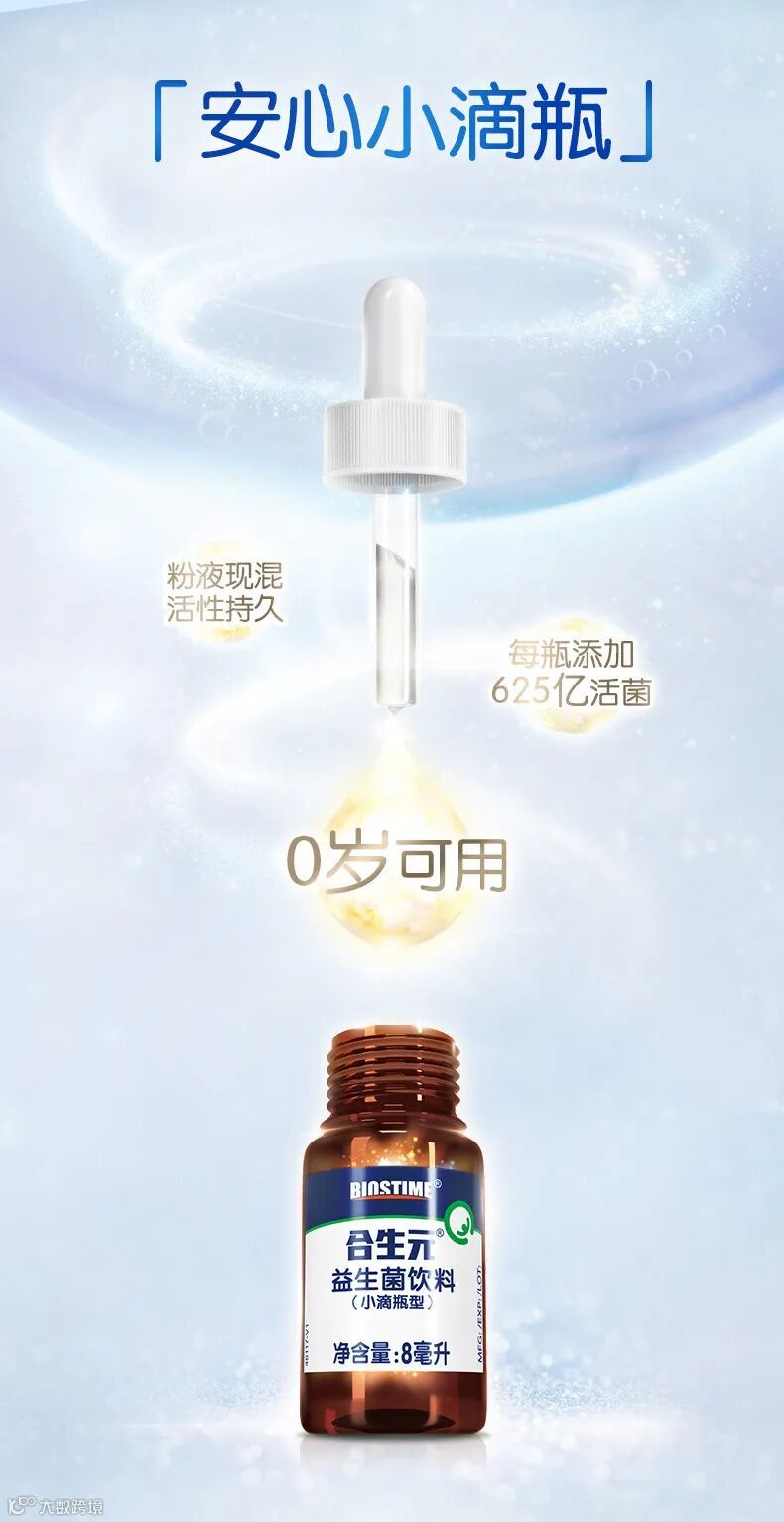 此次新出的“安心小滴瓶”成为了益生菌家族又一员“大将”,以“安心小滴瓶,耀目新生”概念,不仅展现了合生元益生菌系列全新研发成果,更在使用方面做出了颠覆式设计。