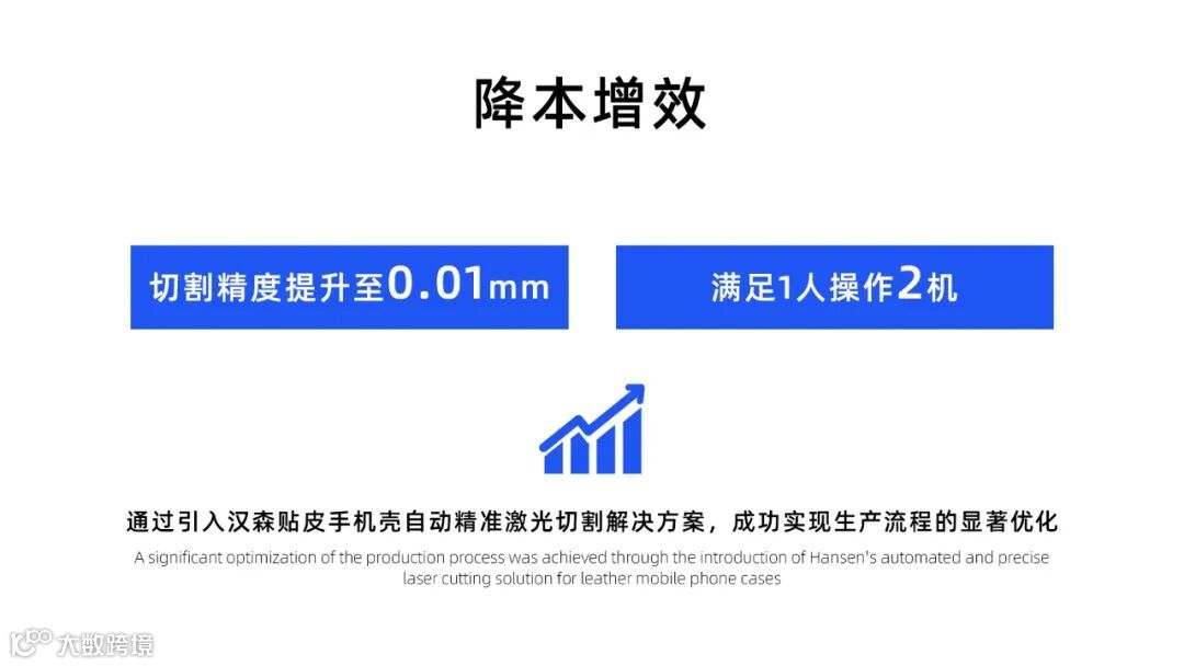 汉森凭借在工业打印领域以及手机壳制造行业的深厚积累,推出贴皮手机壳自动精准激光切割解决方案,旨在通过智能制造系统加持,解决人工排版对位效率低、皮革切割边缘易发黄发黑、产能效率难以提升等问题,帮助企业真正实现降本、增效、提质。