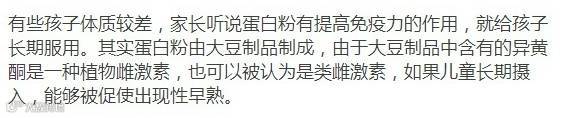 医生说蛋白粉主要是大豆蛋白,其中含有大豆异黄酮是类雌激素,会导致性早熟。那豆腐、豆浆咋办?其实大豆异黄酮含量相当低,更何况它只是类激素,和真正的人雌激素比起来作用差1000倍,正常食用不会性早熟的。其实更简单的办法是看豆腐坊老板的孩子喝豆浆吃豆腐有没有性早熟的。