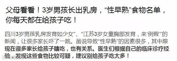 而如果用“宁可信其有”来辩护,那你啥也别吃了,因为我很可能会能找到“好几个性早熟的孩子都喜欢吃”的证据。(编辑:Ent)