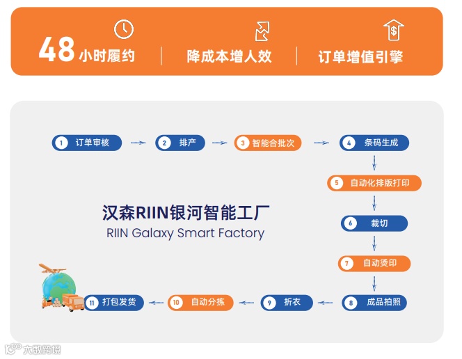RIIN 银河跨境全链路一体化解决方案从用户痛点入手,集订单、生产、仓储、财务管理等功能于一体,助力服装供应链企业实现 48 小时极速履约、降成本提人效,同时通过订单增值引擎全面增强企业竞争力。