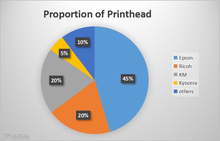 Epson has the largest number of printheads, followed by KM and Ricoh.