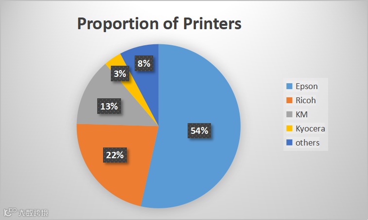 The number of printer with Epson is the largest, accounting for 54%.