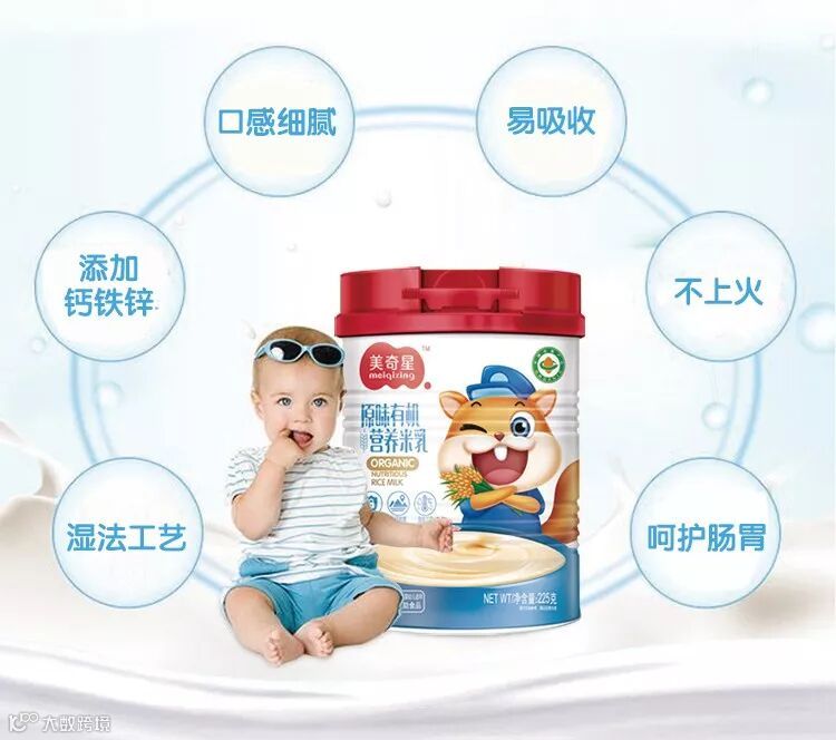 这里潮妈帮推荐美奇星有机婴幼儿营养米乳,添加铁锌钙等矿物质及多种维生素组合,采用二次预糊化技术, 米乳糊化后冲调更细腻顺滑,营养分布更均衡,更容易消化吸收。