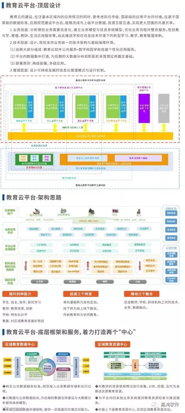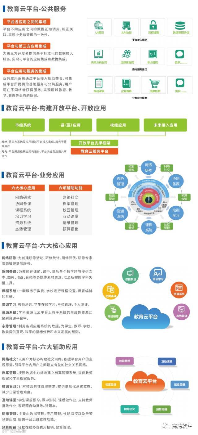 高鸿普教教育云平台核心思路是构建以学习者为中心,融合校内学习与校外学习,沟通学校、家庭、社会的开放式数字化教育服务体系。建设涵盖教育资源共享与服务平台、基础数据管理与支撑平台、教育信息交流与服务平台等内容的专业教育门户,加强数字化优质教育资源开发、引进和应用,为学校教育提供丰富的教育资源。推进教育管理信息化,创新政务管理和校务管理,提升教育公共服务水平。
