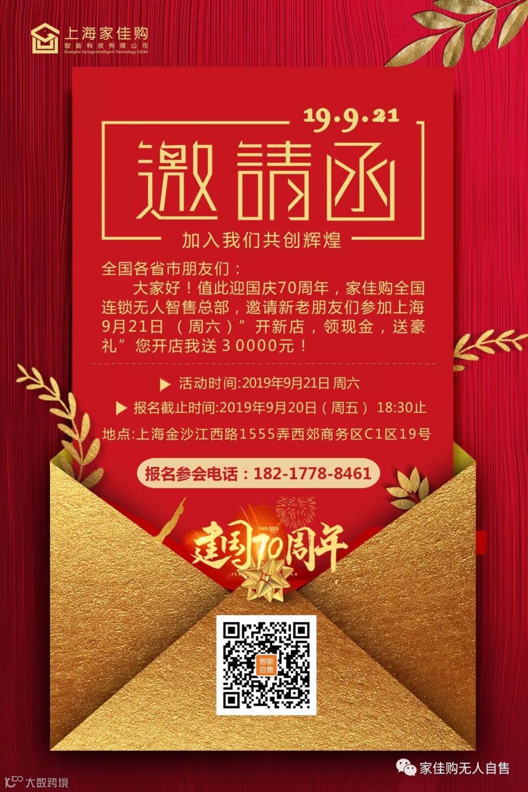 上海家佳购全国连锁无人便利店总部,特在“迎国庆”之前,于9月21日(本周六)举办“开新店、领现金、送豪礼”活动,您开店我送30000元。