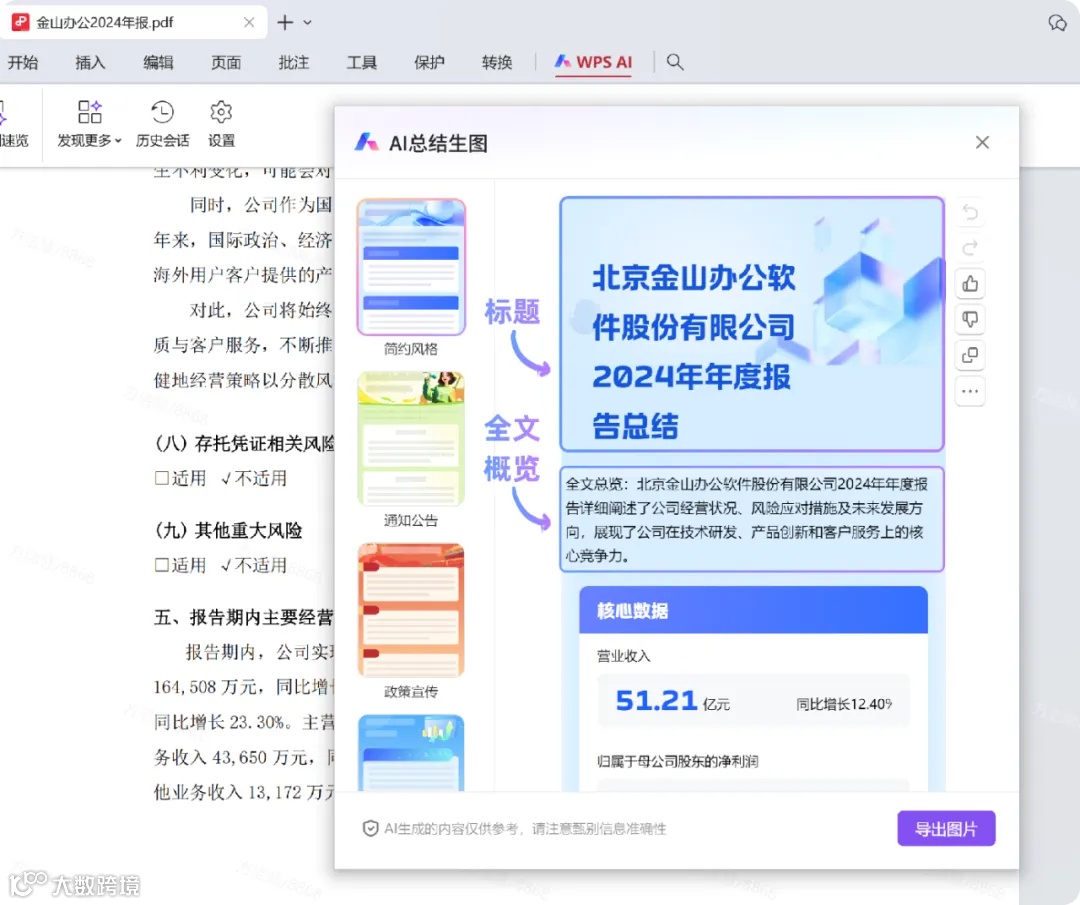 WPS AI总结生图新增AI总结能力,可智能提取重点文字与关键数据,一键生成长图,让复杂文档一目了然。