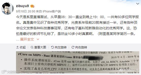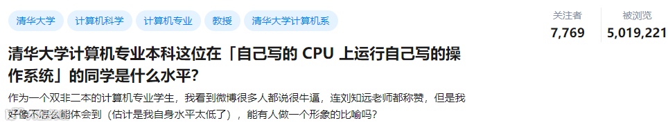 清华大学直博面试的一则简历近日上了知乎热榜,其中写道:“实现了在自己写的CPU上运行自己写的操作系统,以及自己实现的编译器生成的程序。”简历主人是清华计算机系本科生,清华刘知远老师也在微博&知乎上不吝赞美。
