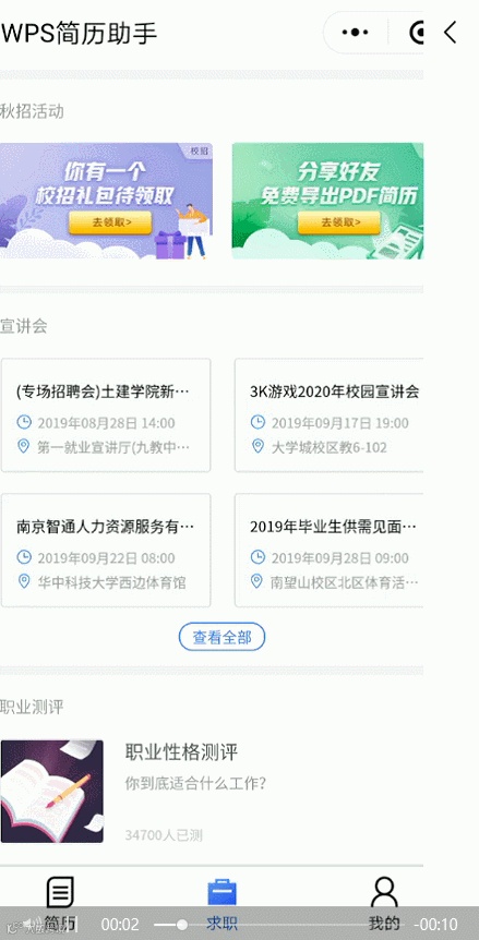 WPS简历助手小程序全新上线宣讲会功能,不管你身处山南海北哪处角落,都能及时获悉距离自己最近、最新的宣讲会信息,飞速奔赴求职现场。