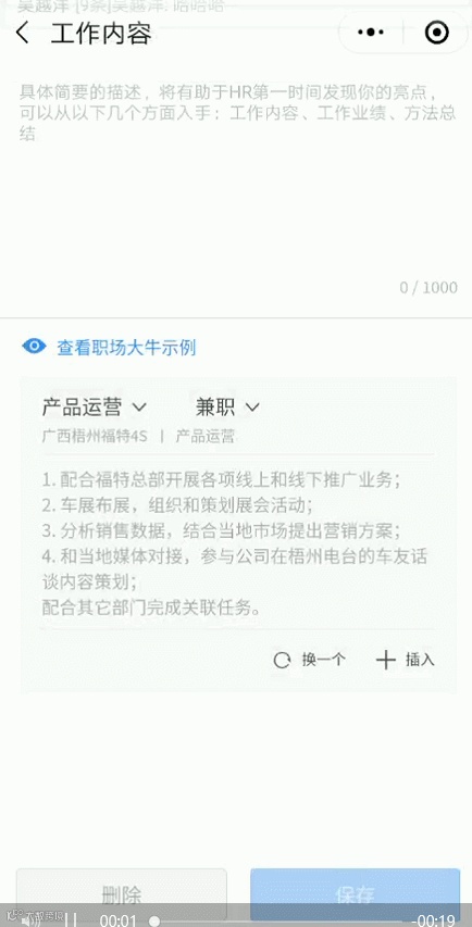 从个人信息、实习经历、项目经验到自我评价,当你编辑相应的模块时,WPS简历助手小程序都有对应的撰写tips和职场大牛示例。