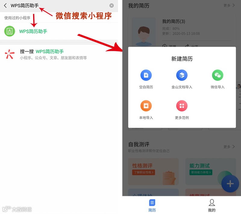 入口一:在微信中搜索【WPS简历助手】小程序,打开后便能直接进行简历制作。