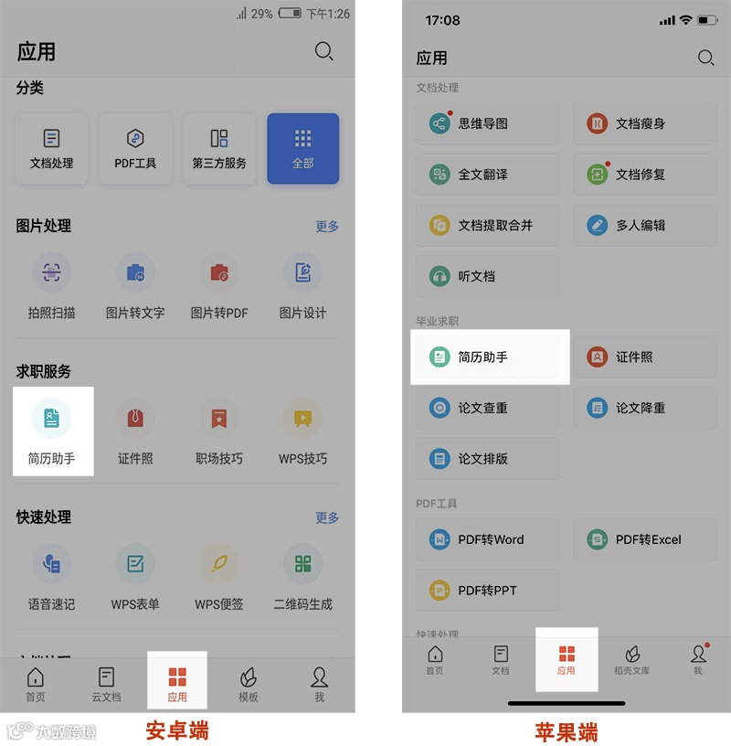 打开WPS客户端,底部切换至“应用”,找到「简历助手」功能