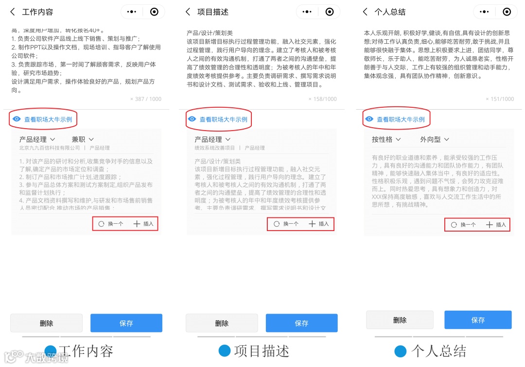 您可以选择需要的模块、行业以及岗位,浏览并参考各行业职场大咖的简历论述,让你从中获取灵感,并且获得正确的指导,写出更让HR认可的简历措辞,并且支持一键插入,告别繁琐的编辑操作。