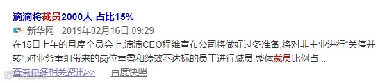 2月15日滴滴月度全员会上,CEO程维宣布公司预计裁掉2000人,占全员15%。