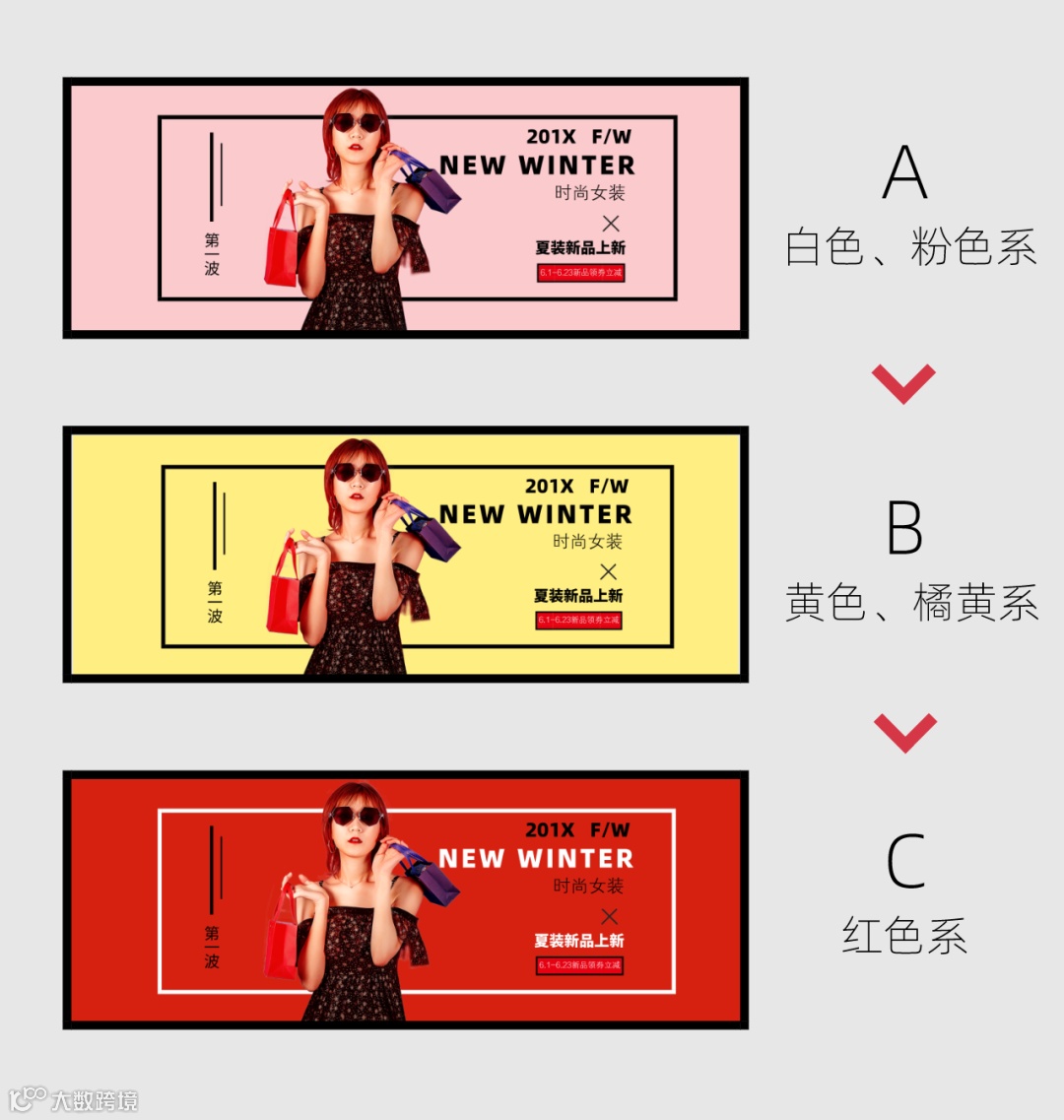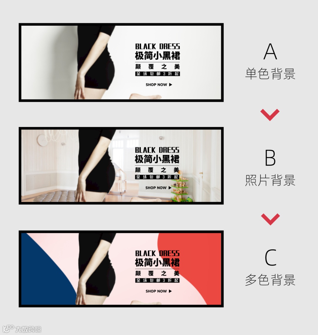 对于女装而言,单色背景点击率最高,简约的背景气氛可以提升产品的品质感。照片的效果仅次于单色,色块较多的背景,点击率较低