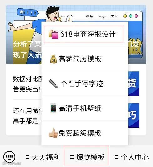 甚至在手机端都可以轻松制作海报,只需要在【WPS稻壳资源】菜单栏点击【爆款模板】—【618电商海报设计】即可进入图片设计的主页。