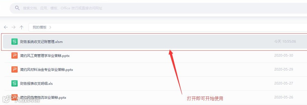 进入到【我的模板】文件夹后找到【财务系统收支记账管理.xlsm】,打开即可开始使用。