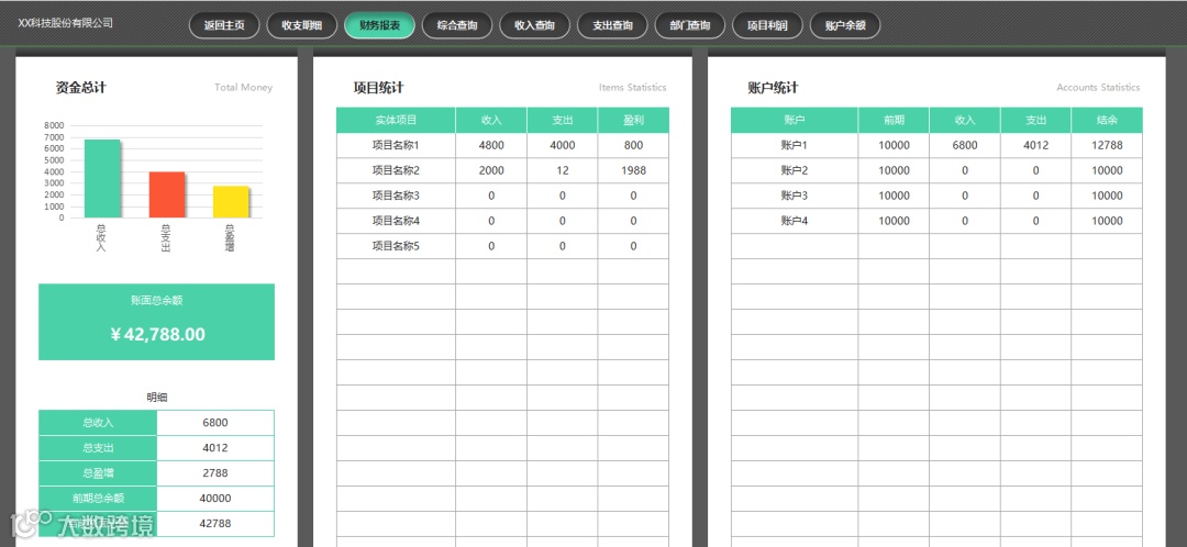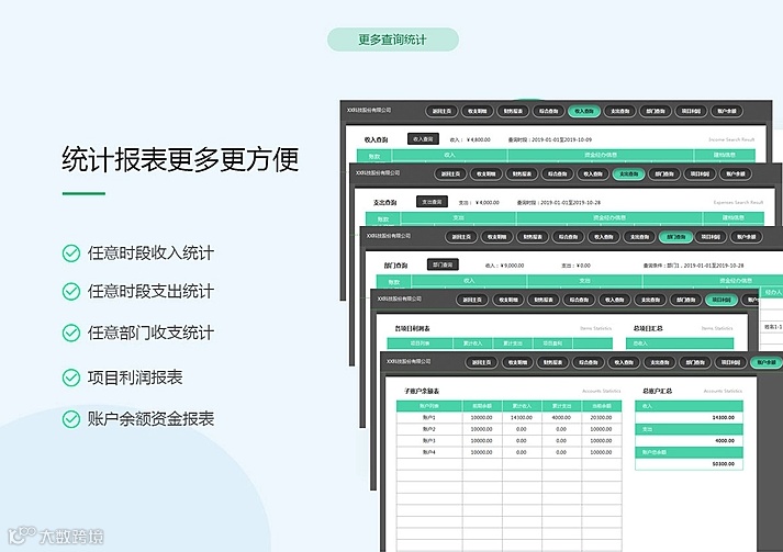 这款超级模板另外的强大之处,在于它多样报表输出的能力,可以输出任意时段收入统计、任意时段支出统计、任意部门收支统计、项目利润报表,项目余额资金报表,全方位的满足财务人员的需求。