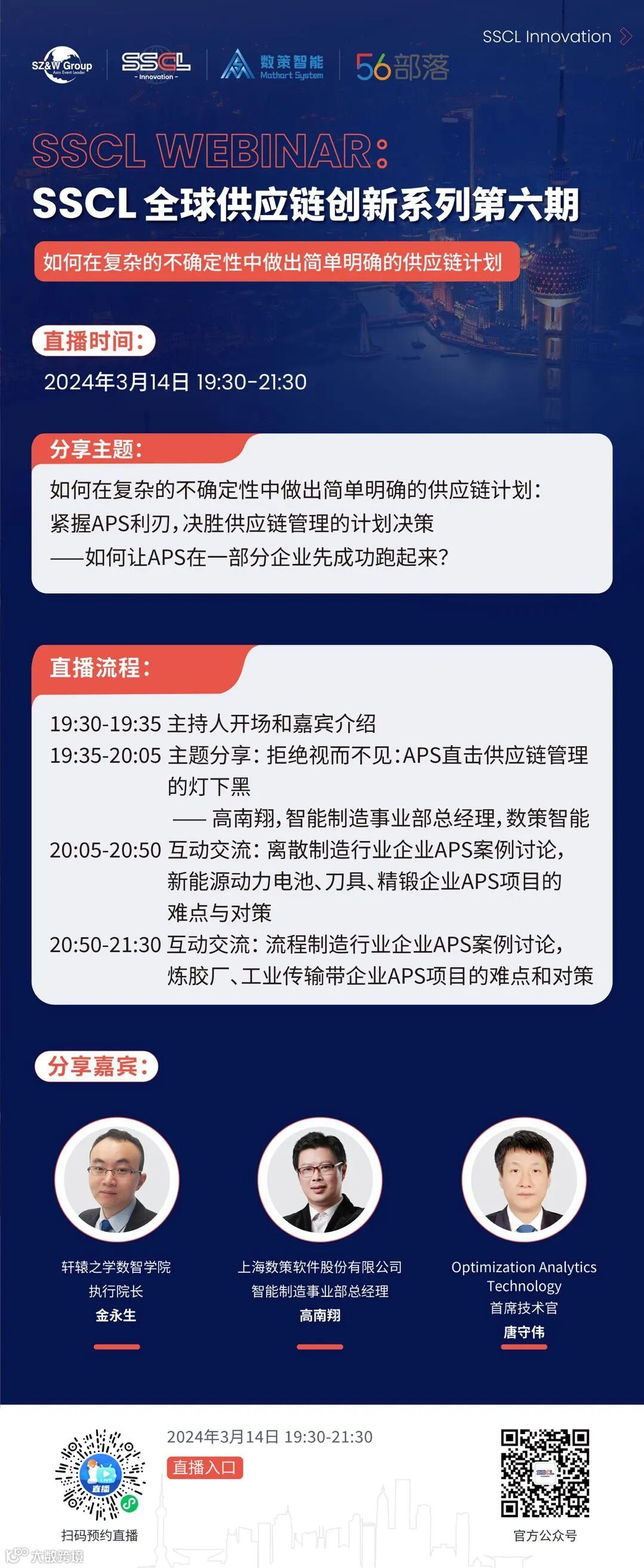 2024年3月14日晚上19:30-21:30,由SSCL Innovation主办的“SSCL全球供应链创新系列”线上Webinar将准时开播。本期将以“如何在复杂的不确定性中做出简单明确的供应链计划?”为核心主题,就“如何让APS在一部分企业先成功跑起来”和“算清糊涂账,拒绝灯下黑”展开讨论,欢迎广大从业者参与交流与学习!