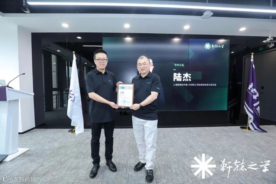 轩辕之学铃轩班,以“打造中国汽车供应网络最强生态圈”为己任,面向汽车行业零部件企业领导人推出供应链进化方向的顶级创新课程,师资力量由多为产业主流车企采购领导人、研发领导人和行业专家构成,致力于为中国汽车零部件行业向上提供三大武器:赋能、链接和化反。数字化变革模块第一天课程正式开始之前,轩辕之学校长、汽车商业评论总编辑、汽场联合创始人贾可博士向数策专家陆杰颁发了导师证书。