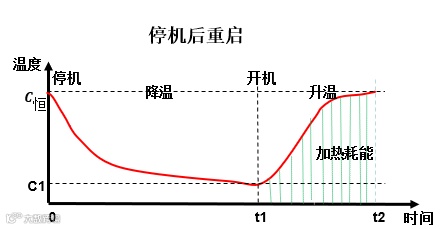 启停模式:着眼于停机管理,在能源监测的基础上,以数学理论分析启停最优时间,此计算可转化为优化问题,能耗见下图绿色部分。