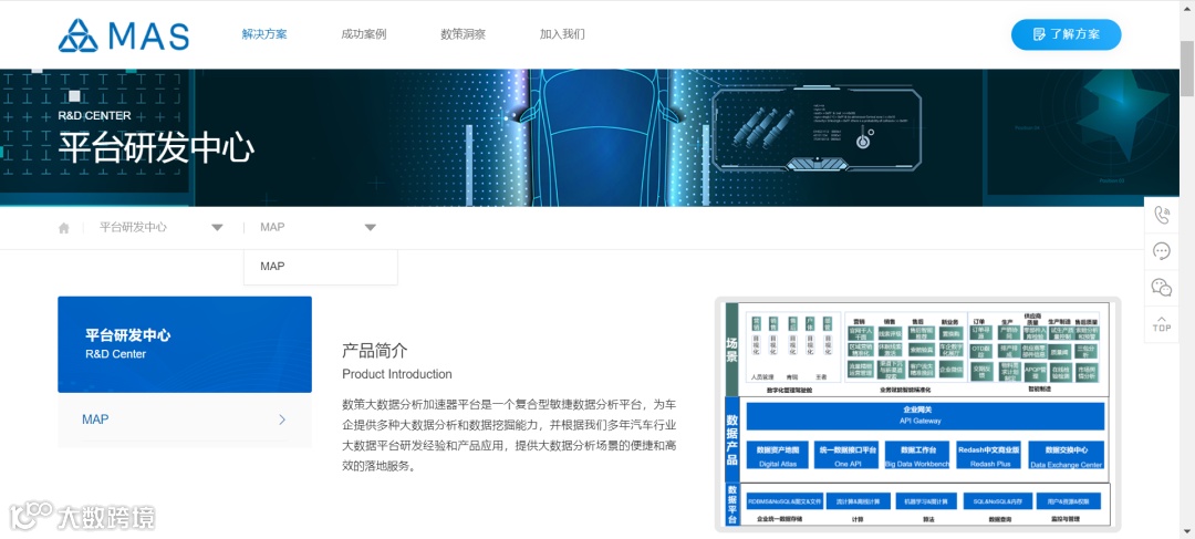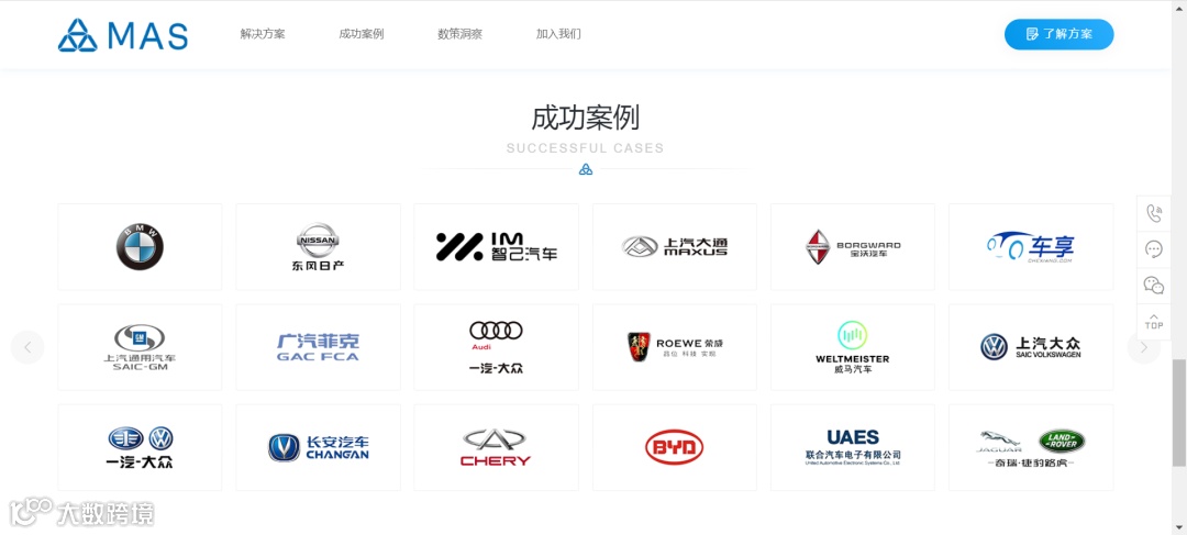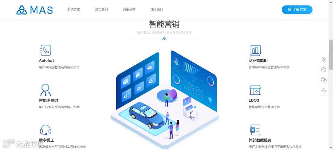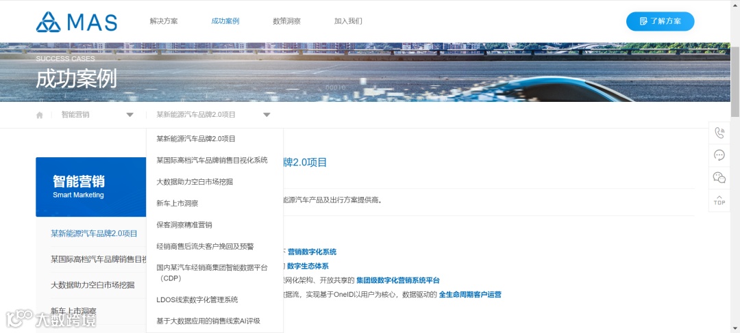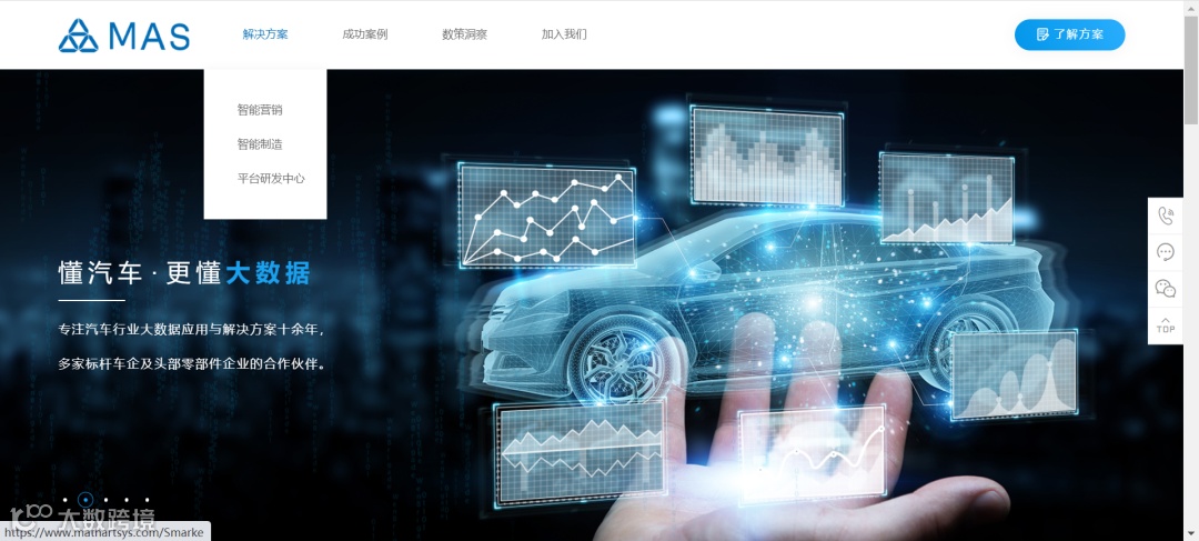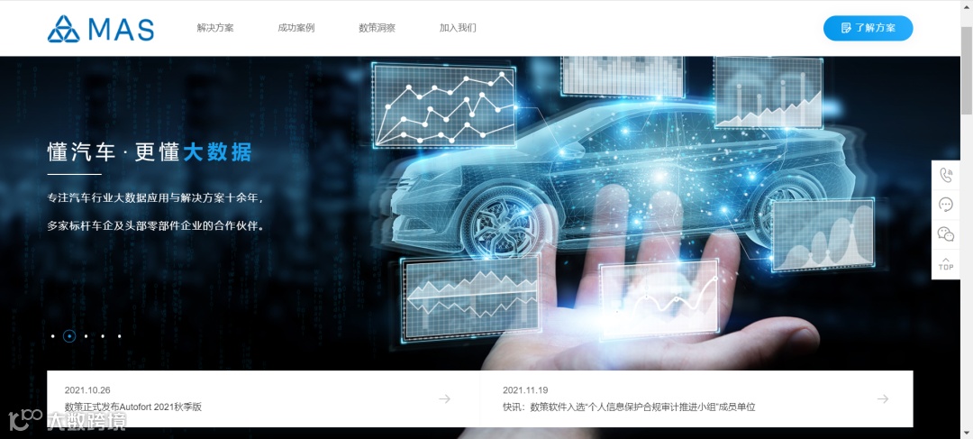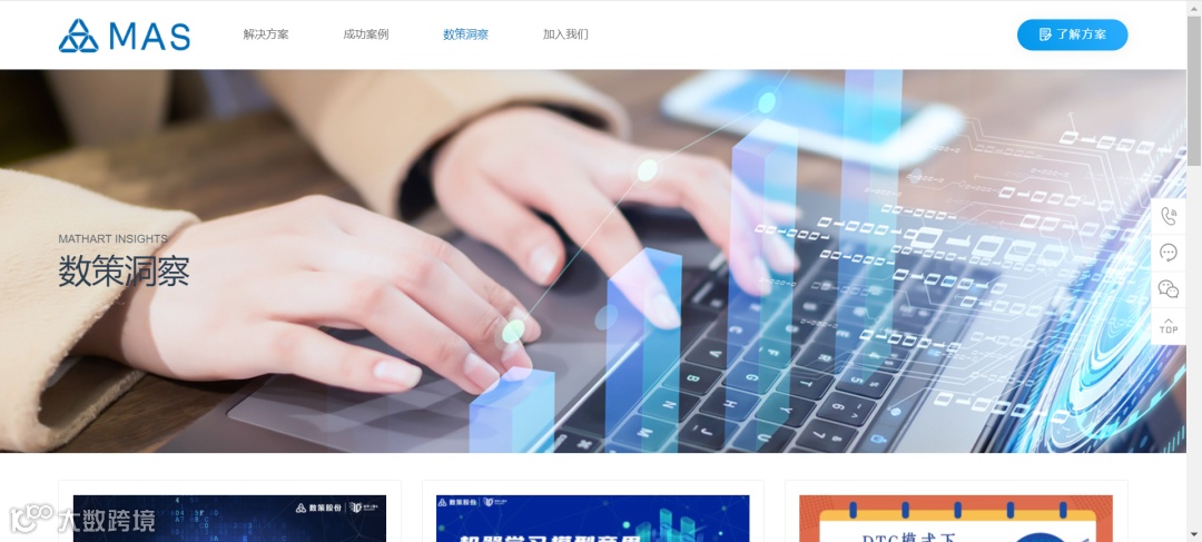 四个主菜单栏:解决方案、成功案例、数策洞察、加入我们。