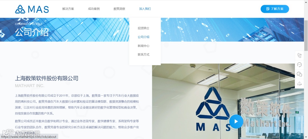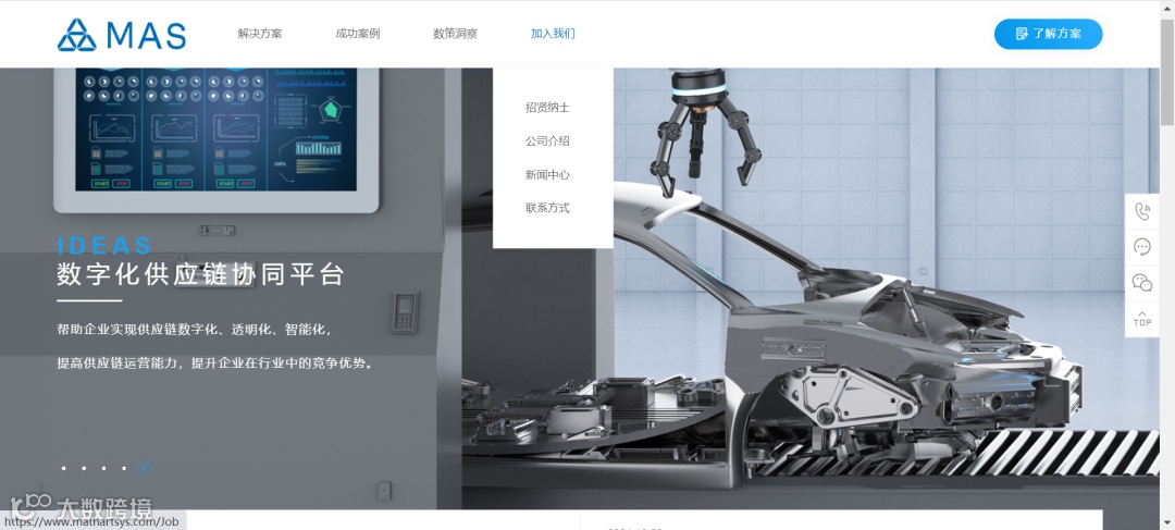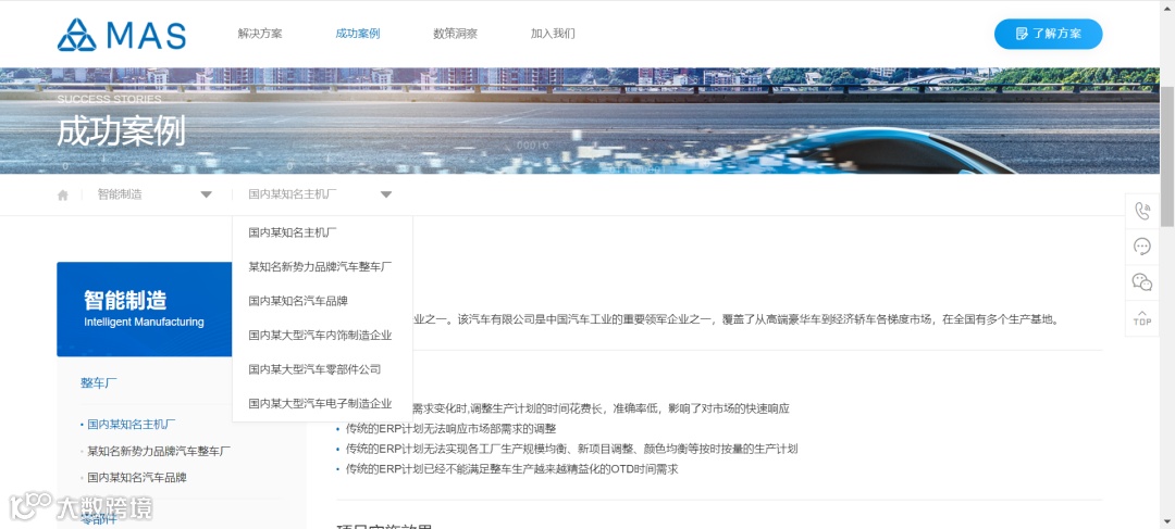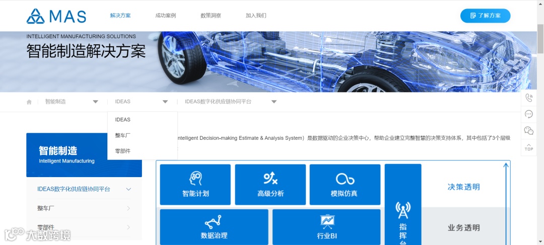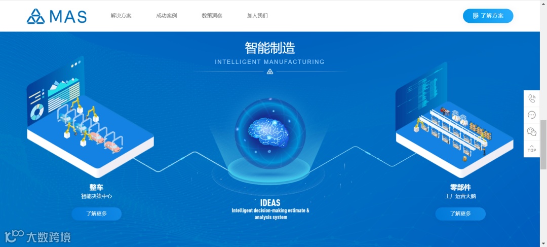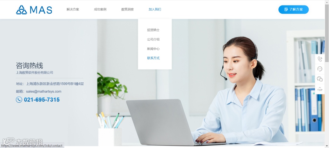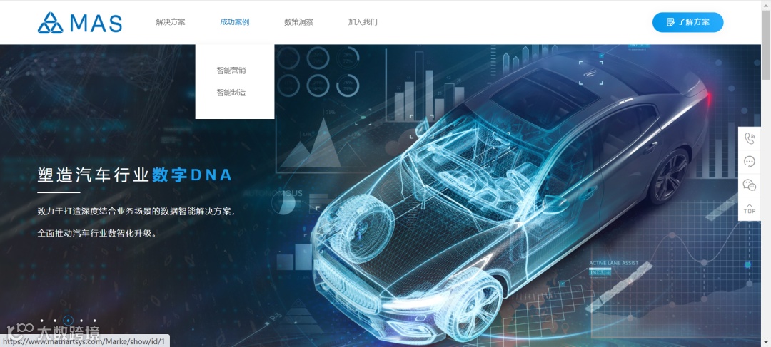 四个主菜单栏:解决方案、成功案例、数策洞察、加入我们。